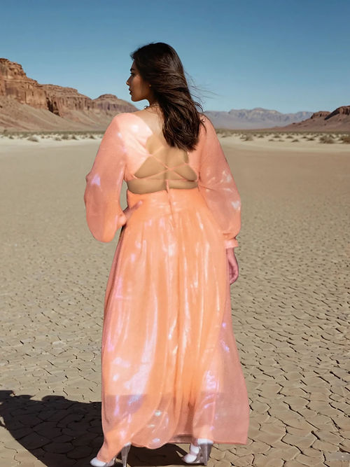 This formal dress is a captivating blend of luxury and elegance, made from Zari metallic Chiffon Jacquard fabric that offers both texture and shine. The fabric's soft chiffon base is elevated by jacquard patterns, creating an intricate, almost textured effect that feels timeless. The metallic zari threads woven throughout give the dress a beautiful, subtle sheen, catching the light with every movement.