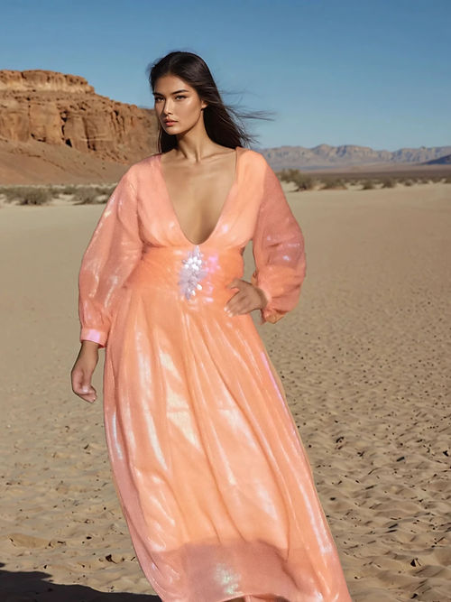 The dress features a daring open V-neckline, which draws attention to the collarbone and neckline, offering a flattering and slightly sensual touch. This plunging V accentuates the waistline, creating a balanced and elongated look.