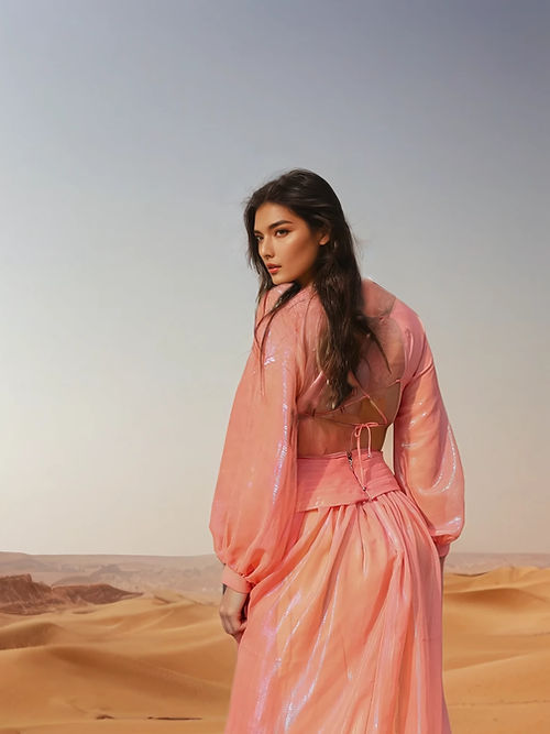 This formal dress is a captivating blend of luxury and elegance, made from Zari metallic Chiffon Jacquard fabric that offers both texture and shine. The fabric's soft chiffon base is elevated by jacquard patterns, creating an intricate, almost textured effect that feels timeless. The metallic zari threads woven throughout give the dress a beautiful, subtle sheen, catching the light with every movement.